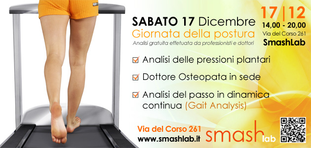 SmashLab, primo laboratorio di test e analisi delle wellness shoes, dette anche scafrep posturali o benessere, organizza la prima giornata gratuita per il controllo della postura con l'assistenza di dottori, osteopati, esperti di riflessologia plantare e tecnici specializzati in macchinari di alto livello per la cura e la riabilitazione posturale.